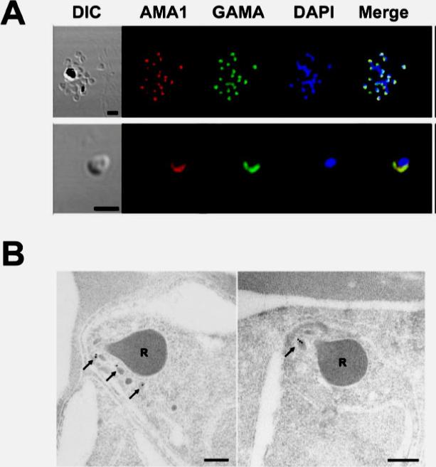 Localization of GAMA in asexual blood stage parasites. (A) GAMA localization using immuno-fluorescence assay. Acetone-fixed P. falciparum 3D7 mature schizonts (top panel) and free merozoites (bottom panel) were probed with rabbit anti-FL (green) and mouse anti-PfAMA1 (microneme marker)(red). Parasite nuclei were stained with DAPI (blue). Scale bars represent 2 μm. (B) GAMA localization using immunoelectron microscopy. The two sections of merozoites in schizont-infected erythrocytes were probed with purified rabbit anti-Tr3 antibody and subsequently by secondary antibody conjugated with gold particles. The arrows indicate the micronemal localization of signals from gold particles. Bars represent 200 nm. Arrows mark micronemes.Arumugam TU, Takeo S, Yamasaki T, Thonkukiatkul A, Miura K, Otsuki H, Zhou H, Long CA, Sattabongkot J, Thompson J, Wilson DW, Beeson JG, Healer J, Crabb BS, Cowman AF, Torii M, Tsuboi T. Discovery of GAMA, a Plasmodium falciparum merozoite micronemal protein, as a novel blood-stage vaccine candidate antigen. Infect Immun. 2011 79(11):4523-32