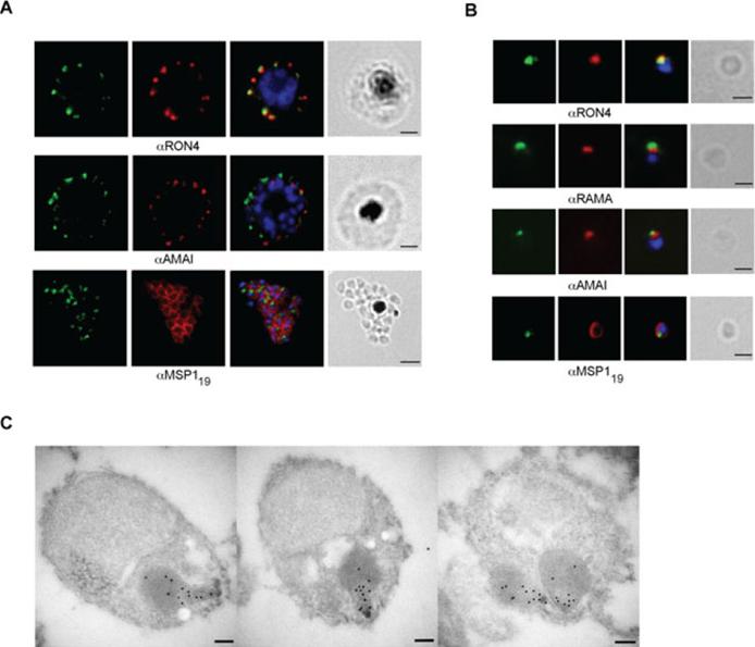 The appearance of Plasmodium falciparum merozoites and rings of the ITO4 line at different times of development. Antibodies to proteins associated with invasion related organelles or the parasite periphery (rhoptries : RAP-1; micronemes: AMA-1, EBA-175; dense granules: RESA; parasite periphery: MSP-1, myo-A) were chosen to follow the development and assembly of merozoites and rings.Margos G, Bannister LH, Dluzewski AR, Hopkins J, Williams IT, Mitchell GH. Correlation of structural development and differential expression of invasion-related molecules in schizonts of Plasmodium falciparum. Parasitology. 2004 129:273-87. Copyright Cambridge University Press Journals 2011