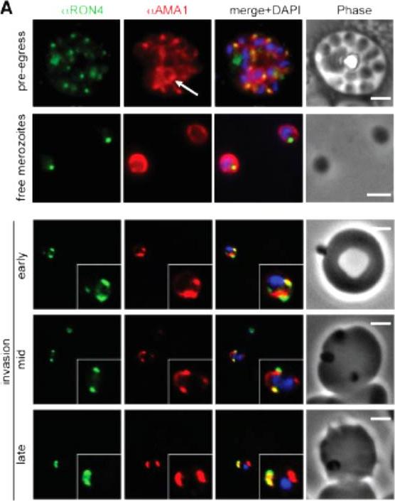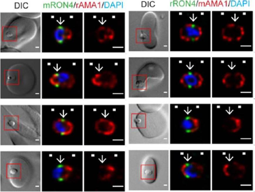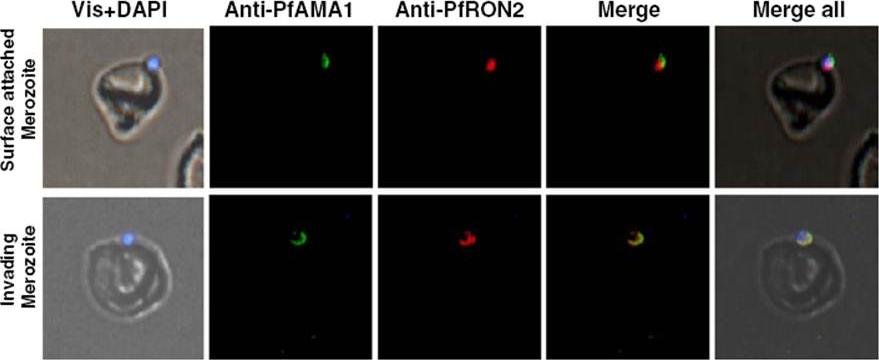 Immunofluorescence assay showing co-localization of PfRON2 with PfAMA1 at apical end at the time of meozoite attachment during merozoite invasion. At the time of attachment of the merozoite with the host RBCs, the PfRON2 staining was at the apical tip, the PfAMA1 staining was also mainly at the apical tip and with some distribution at the merozotie surface. During parasite invasion, the PfRON2 and PfAMA1 showed col-ocalization at the apical end of merozoite.Hossain ME, Dhawan S, Mohmmed A. The cysteine-rich regions of Plasmodium falciparum RON2 bind with host erythrocyte and AMA1 during merozoite invasion. Parasitol Res. 2011 110(5):1711-21