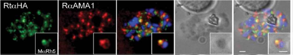 Immunofluorescence and phase contrast images of late schizonts or free merozoites (insets) to colocalise PfRh5 with AMA1. Each panel from left top right corresponds to anti-HA antibodies (to detect PhRh5), rabbit anti-AMA-1, overlay of each with DAPI nuclear stain, phase contrast and overlay of all images. Insets show individual merozoites. Scale bars = 1 mM. Baum J, Chen L, Healer J, Lopaticki S, Boyle M, Triglia T, Ehlgen F, Ralph SA, Beeson JG, Cowman AF. Reticulocyte-binding protein homologue 5 - An essential adhesin involved in invasion of human erythrocytes by Plasmodium falciparum. Int J Parasitol. 2008 39(3):371-80 Copyright Elsevier 2009.