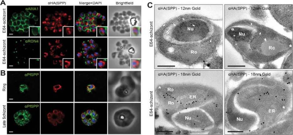 PfSPP localises to the parasite nuclear periphery.(A) IFA of E64 treated PfSPP-HA schizonts labeled with anti-PfAMA1, PfRON4 and HA antibodies. Scale bar 1 μm. Inset displays magnification of single merozoite. (B) IFA of ring and late schizont stage PfSPP-HA parasites labeled with anti-PfSPP and HA antibodies. Scale bar 1 mm. (C) Immuno-electron micrograph of E64 treated PfSPP-HA schizonts with 12 nm or 18 nm immunogold. Arrowheads mark 12 nm immunogold labels and white asterisks marks parasite apex. Nucleus (Nu), endoplasmic reticulum (ER) and rhoptry (Ro). Scale bar = 200 nm. PfSPP is an ER-resident peptidase that remains intracellular throughout the invasion process.Marapana DS, Wilson DW, Zuccala ES, Dekiwadia CD, Beeson JG, Ralph SA, Baum J. Malaria parasite signal peptide peptidase is an ER-resident protease required for growth but not invasion. Traffic. 2012 13(11):1457-65