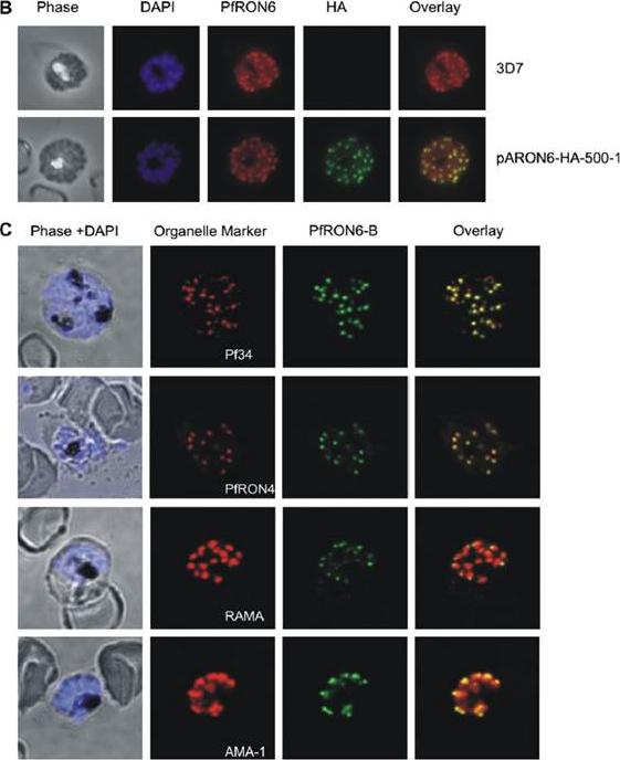 Localisation of the PfRON6 protein in parasitised red blood cells. (B) Double labelling using anti-rPfRON6-B and anti- haemagglutinin (HA) in HA-tagged transgenic parasites. Confocal microscopy using anti-rPfRON6-B with anti-HA. Corresponding overlay images are shown. (C) Double labelling of PfRON6 with Pf34, PfRON4, RAMA or AMA1 in segmented schizonts. Confocal microscopy using anti-rPfRON6-B with anti-Pf34 (rhoptry neck marker), anti-PfRON4 (rhoptry neck marker), anti-RAMA (rhoptry bulb marker), or anti-AMA1 (microneme marker). Corresponding overlay images are shown. a punctate pattern of fluorescence in segmented schizonts characteristic of localisation with the apical secretory organelles.Proellocks NI, Kats LM, Sheffield DA, Hanssen E, Black CG, Waller KL, Coppel RL. Characterisation of PfRON6, a Plasmodium falciparum rhoptry neck protein with a novel cysteine-rich domain. Int J Parasitol. 2008 39(6):683-92. Copyright Elsevier 2009.
