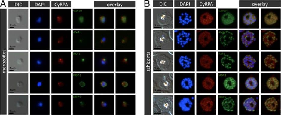 Localization of CyRPA to the merozoite apex by immunofluorescence staining. P. falciparum 3D7 merozoites (A) or schizont stages (B) were coimmunostained with anti-CyRPA mAb c06 (red) and anti-GAPDH Abs (marker for cytosol), AMA-1 (marker for micronemes), RAP-1 (marker for rhoptry bulbs), MSP-1 (marker for merozoite surface), or MSP-5 (green). Nuclei were stained with DAPI (blue). Original magnification x1008. CyRPA is localized at the merozoite apex.Dreyer AM, Matile H, Papastogiannidis P, Kamber J, Favuzza P, Voss TS, Wittlin S, Pluschke G. Passive immunoprotection of Plasmodium falciparum-infected mice designates the CyRPA as candidate malaria vaccine antigen. J Immunol. 2012 188(12):6225-37.
