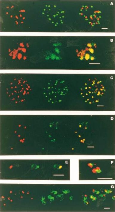 Localization and co-localization of PfPK4, RAP-1, PF14_0102, PF83/AMA-1 PF11_0344 and MSP1 PFI1475w. (A) A segmenter, stained for PfPK4 (red) and RAP-1 (green), with a composite of both labels on the right ; (B) schizont ; (C) segmenter ; (D) and (E) free merozoites, stained for PfPK4 (red) and PF83/AMA-1 (green), with composites on the right ; (F) a free merozoite, a composite of PfPK4 (red) and RAP-1 (green); (G) free merozoites stained for PfPK4 (red) and MSP-1 (green), with a composite of both labels on the right. The scale bars represent 2 mm. PfPK4 distributed throughout the trophozoite, whereas it was found in discrete foci (punctate distribution) in segmenters. PfPK4 co-localizes with AMA-1 at the apical complex in segmenters and merozoites, but does not co-localize with RAP-1.Reproduced with permission, from Möhrle JJ, Zhao Y, Wernli B, Franklin RM, Kappes B. Molecular cloning, characterization and localization of PfPK4, an eIF-2a kinase-related enzyme from the malarial parasite Plasmodium falciparum. Biochem J. 1997 328:677-87. © the Biochemical Society.