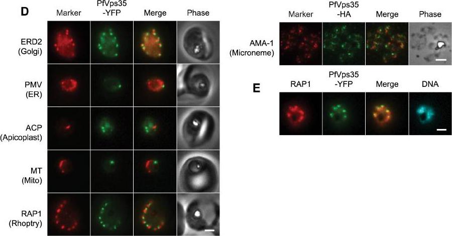 (D) Co-localization of PfVps35-YFP or PfVps35-HA and organellar markers in fixed parasites (except for MitoTracker, which was imaged live). PMV, plasmepsin V; ACP, acyl carrier protein; MT, MitoTracker Red CM-H2Xros; RAP1, rhoptry associated protein 1; AMA1, apical membrane antigen 1. The AMA1 panel shows free merozoites; all others are intraerythrocytic. Organelles labeled by the markers are indicated in parenthesis. Marker-derived fluorescence is pseudocolored red. (E) PfVps35-YFP is adjacent to developing rhoptries in a 2N parasite. Hoechst 33342 fluorescence (DNA) is pseudocolored cyan. In all panels, YFP fluorescence is pseudocolored green. Scale bars, 2 mm.Krai P, Dalal S, Klemba M. Evidence for a Golgi-to-Endosome Protein Sorting Pathway in Plasmodium falciparum. PLoS One. 2014 9(2):e89771.