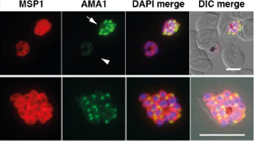 Spatial localization of merozoite’s microneme resident proteins AMA-1 and PfAARP by co-immunostaining with anti-PfAARP (green) and anti-AMA-1 (red) Abs: both showed punctate staining in the schizonts. In the late schizonts and merozoites, AMA-1 was present over the entire surface of the merozoites but is most densely distributed at their apical tip. Enlarged image of selected individual merozoite is shown in the inset. Wickramarachchi T, Devi YS, Mohmmed A, Chauhan VS. Identification and characterization of a novel Plasmodium falciparum merozoite apical protein involved in erythrocyte binding and invasion. PLoS ONE. 2008 Mar 5;3(3):e1732.