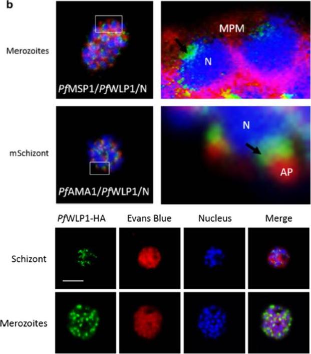 PfWLP1 is expressed in the asexual blood stages of Plasmodium falciparum. Upper panel: Localization of PfWLP1 underneath the apical pole of merozoites. Image enlargements (right) of mature schizonts (left), labelled with antibodies against PfWLP1 (green) and PfMSP1 or PfAMA1 (red) and stained with Hoechst (blue). AP apical pole, N nucleus, MPM merozoite plasma membrane. Bar 5 μm. Data are representative of five independent experiments each. Lower panel: Expression of PfWLP1-HA in asexual blood stages. PfWLP1 expression in the PfWLP1-HA asexual blood stages. PfWLP1-HA was immunolabelled with anti-HA antisera (green); the asexual blood stages were visualized by Evans Blue counterstaining (red). The parasite nuclei were highlighted by Hoechst nuclear stain (blue),von Bohl A, Kuehn A, Simon N, Ngongang VN, Spehr M, Baumeister S, Przyborski JM, Fischer R, Pradel G. A WD40-repeat protein unique to malaria parasites associates with adhesion protein complexes and is crucial for blood stage progeny. Malar J. 2015 Nov 4;14(1):435.
