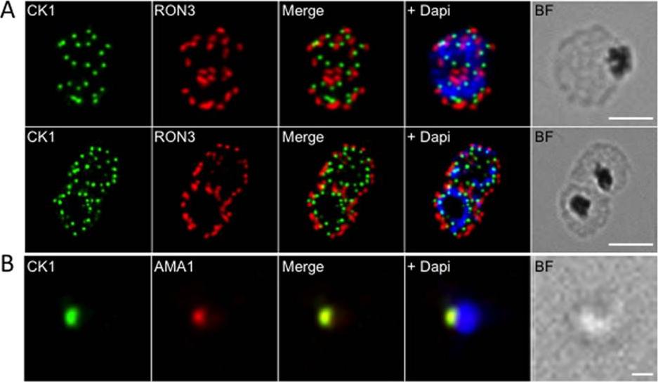 Localisation of PfCK1 in micronemes. (A) Localisation of PfCK1 and PfRON3 in schizonts and segmenters. DAPI was used to stain the nucleus and the scale bar represents 10μm. (B) Localisation of PfCK1 and AMA-1 in merozoites. DAPI was used to stain the nucleus and the scale bar represents 1μm. A punctate pattern emerges in segmenters, with one PfCK1 dot in each developing merozoite, adjacent to the rhoptry marker RON3. In line with this observation, PfCK1 colocalises with AMA-1, a protein of micronemes that is released at the very early stages of invasion.Dorin-Semblat D, Demarta-Gatsi C, Hamelin R, Armand F, Carvalho TG, Moniatte M, Doerig C. Malaria Parasite-Infected Erythrocytes Secrete PfCK1, the Plasmodium Homologue of the Pleiotropic Protein Kinase Casein Kinase 1. PLoS One. 2015 10(12):e0139591.