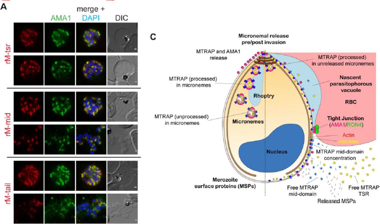 MTRAP is cleaved within the micronemes. A) IFA of compound 1 (C1) treated schizonts co-labelled with mAMA1 antibodies (green) and rM-tsr (top panels), rM-mid (middle panels) or rM-tail (bottom panels) (red in respective images). Scale bars = 1 μm. C) Schematic of pre- (left half) and post- (right half) invasion merozoites, showing the predominant distribution of each protein tested as part of this study. It should be noted that all proteins show a degree of variability in labelling distributions across merozoites imaged to an extent that is not possible to depict here.Riglar DT, Whitehead L, Cowman AF, Rogers KL, Baum J. Localization-based imaging of malarial antigens during red cell entry reaffirms role for AMA1 but not MTRAP in invasion. J Cell Sci. 2015. [Epub ahead of print]