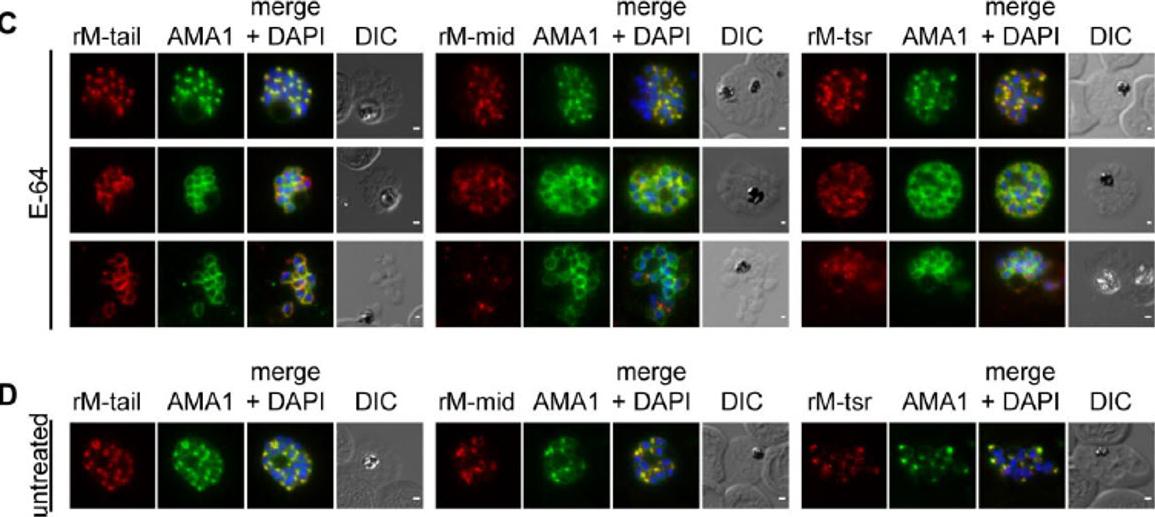 MTRAP is cleaved irrespective of both invasion and egress from the schizont. (C) treated with E-64 to prevent egress or (D) from untreated culture, co-labelled AMA1 monoclonal antibodies (green) and rM-tail (left), rM-mid (middle) or rM-tsr (right) (red in respective images). Scale bars = 1 μm.Riglar DT, Whitehead L, Cowman AF, Rogers KL, Baum J. Localization-based imaging of malarial antigens during red cell entry reaffirms role for AMA1 but not MTRAP in invasion. J Cell Sci. 2015. [Epub ahead of print]
