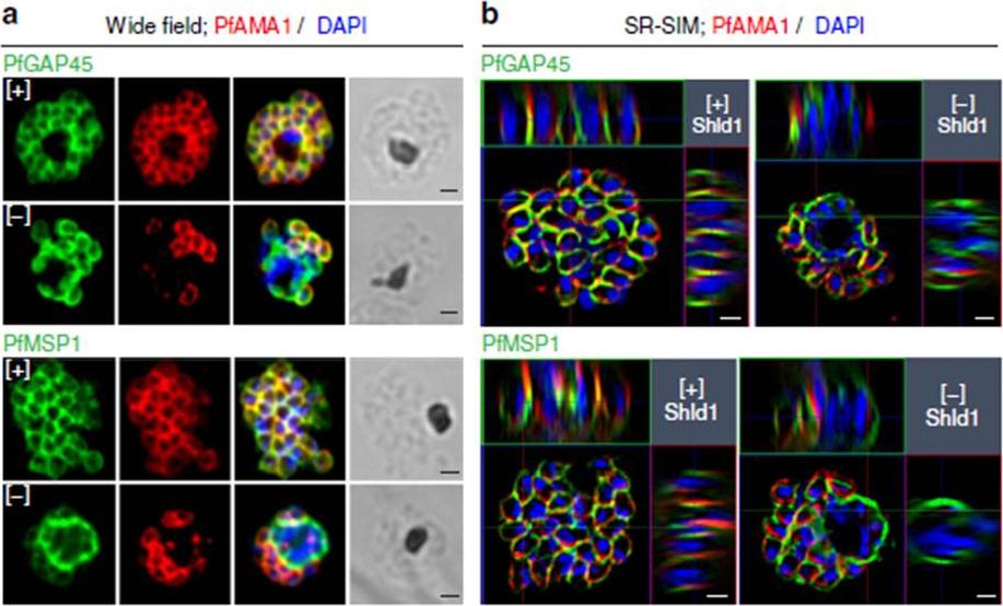 PfMOP deficiency leads to incomplete formation of the IMC. (a) Wide-field and (b) SR-SIM (super-resolution structured illumination microscopy) of representative pictures of E64-treated [+]/[-] Shld1 schizont stage PfMOP-DD parasites using antibodies against PfGAP45 and PfMSP1. Scale bar, 1 mm.Absalon S, Robbins JA, Dvorin JD. An essential malaria protein defines the architecture of blood-stage and transmission-stage parasites. Nat Commun. 2016 7:11449.