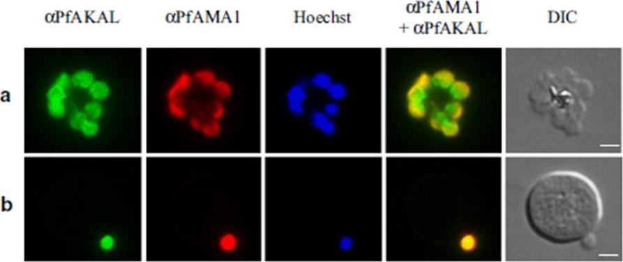 PfAKAL localization in P. falciparum merozoites by indirect immunofluorescence assays. Images with PfAKAL localization (green), PfAMA1 localization (red), Hoechst DNA staining (blue) and differential interference contrast (DIC) and were taken. a P. falciparum 3D7 egressing merozoites, b P. falciparum 3D7 invading merozoite. The bars represent 2 μm. PfAKAL is expressed in egressing (a) and invading (b) merozoites.Bandje K, Naissant B, Bigey P, Lohezic M, Vayssières M, Blaud M, Kermasson L, Lopez-Rubio JJ, Langsley G, Lavazec C, Deloron P, Merckx A. Characterization of an A-kinase anchoring protein-like suggests an alternative way of PKA anchoring in Plasmodium falciparum. Malar J. 2016 15(1):248.