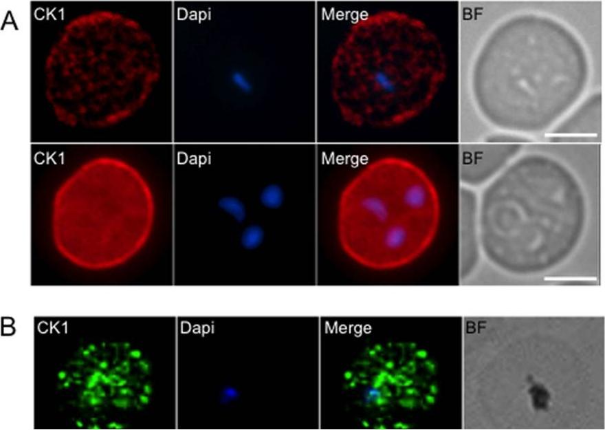 PfCK1 immunofluorescence assay on wild-type parasites and transgenic parasites expressing a GFP-tagged PfCK1. (A) 3D7 parasites were examined by immunofluorescence using an anti-PfCK1 serum labelled with rhodamine. DAPI was used to stain the nucleus and the scale bar represents 10 μm. A pre-immune serum used as a negative control did not yield any signal (not shown). (B) An erythrocyte culture infected with synchronised parasites expressing GFP-tagged PfCK1 from the endogenous locus was examined by immunofluorescence using an anti-GFP antibody. DAPI was used to stain the nucleus the scale bar represents 10 μm. As a negative control wild-type 3D7 parasites stained with the same anti-GFP antibody and did not yield any signal (not shown). A pool of CKI is exported to the host erythrocyte periphery at the early stage of infection, and subsequently detectable mostly within the parasite in late trophozoites and schizonts.Dorin-Semblat D, Demarta-Gatsi C, Hamelin R, Armand F, Carvalho TG, Moniatte M, Doerig C. Malaria Parasite-Infected Erythrocytes Secrete PfCK1, the Plasmodium Homologue of the Pleiotropic Protein Kinase Casein Kinase 1. PLoS One. 2015 10(12):e0139591.