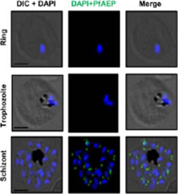 Expression of PfAEP was analyzed in different stages of the asexual blood-stage life cycle by confocal immuno-fluorescence microscopy using anti-PfAEP mouse serum (green). Parasite nuclei were counterstained with DAPI (blue). No detectable PfAEP staining was observed in ringand trophozoite stages. In schizonts, PfAEP was detected as a punctate staining characteristic of many apical organelle resident proteins. The scale bar indicates 2 mm. In schizonts, the staining of PfAEP was observed in a punctate manner towards the apex of individual merozoites similar to other invasion proteins.Hans N, Relan U, Dubey N, Gaur D, Chauhan VS. Identification and localization of a Novel Invasin of Plasmodium falciparum. Mol Biochem Parasitol. 2015 Sep 29. [Epub ahead of print] PMID: