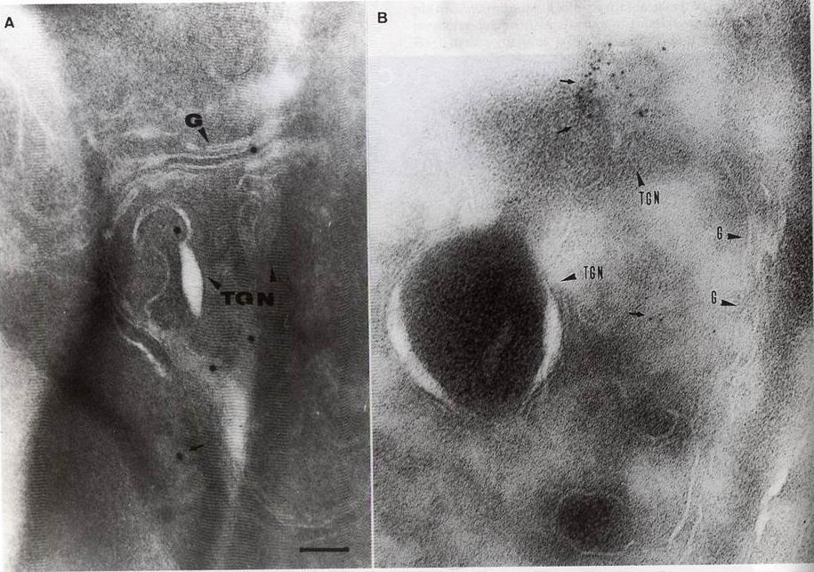 Localization of Rab 6-related proteins. Immunogold labeling of ultrathin sections of parasites with affinity-purified Rab 6 antibodies. A. Gold particles (10 nm) are associated with Golgi stacks (G) and vesicles budding from this stacks (TNGL, trans Gologi-like structures). B. 5 nm gold particles found in close relation with Golgi and vesicles. Bar - 100 nm.Jambou R, Zahraoui A, Olofsson B, Tavitian A, Jaureguiberry G. Small GTP-binding proteins in Plasmodium falciparum. Biol Cell. 1996 88:113-21.