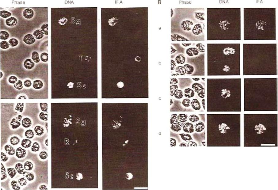 Immunofluorescence localization of Rab6 within P. falciparum-infected erythrocytes. (A) Thin films of cultured parasites were fixed in methanol and incubated with anti-Rab6i antiserum (a), or anti-Rab6i IgG fraction (b), followed by fluorescein-conjugated secondary antibody. Parasites at different stages of the intraerythrocytic cycle (R, ring; note this erythrocyte is infected with two parasites; T, trophozoite: SC, schizont; Sg, segmentor) are indicated. A phase contrast image (Phase) together with the corresponding bisbenzimide H33342 fluorescence (DNA), and immunoflourescence (IFA) images are shown for each sample. Scale bar = 10 mm. (B) lmmunofluorescence controls. Thin films of cultured parasites were fixed in methanol and incubated with anti-Rab6i antiserum (a) pre-immune serum (b) or anti-Rab6i IgG fraction (c, d), followed by fluorescein-conjugated secondary antibody. Before applying to the parasites, the anti-Rab6i IgG used in (c, d) was pre-incubated for 60 min at 23°C with either 125 ,uM peptide Rab6i (c) or 125 /tM peptide Rab6c (d). Scale bar = 5 mm. Immunofluorescence microscopy shows that the distribution of PfRab6 changes during the final stages of parasite maturation, coalescing into multiple foci, each of which is associated with the nucleus of a forming daughter parasite.de Castro FA, Ward GE, Jambou R, Attal G, Mayau V, Jaureguiberry G, Braun-Breton C, Chakrabarti D, Langsley G. Identification of a family of Rab G-proteins in Plasmodium falciparum and a detailed characterisation of pfrab6. Mol Biochem Parasitol. 1996 80:77-88. Copyright Elsevier