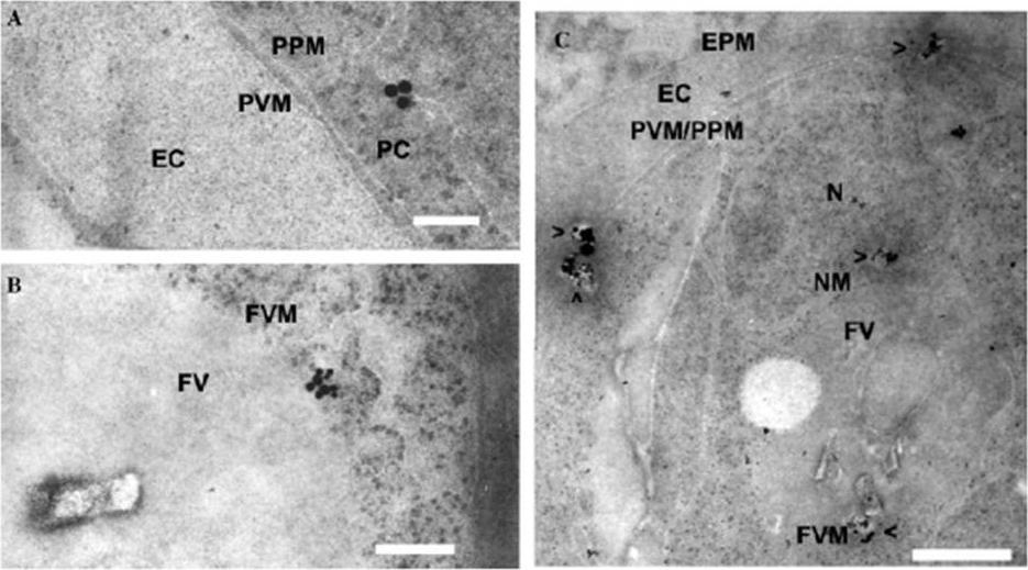 Location of Pfdyn1 in P. falciparum-infected erythrocytes with transmission electron. Percoll-synchonized late stage cells were fixed, and then incubated with purified anti-Pfdyn1-C antibody (1:100). Then incubated for in 15nm gold labeled goat anti-rabbit IgG diluted 1:20 in PBT and stained with uranyl acetate and lead citrate. FV, food vacuole; FVM, food vacuole membrane; EC, erythrocyte cytoplasm; EPM, erythrocyte plasma membrane; PC, parasite cytoplasm; PVM, parasitophorous vacuole membrane; PPM, parasite plasma membrane; N, nuclear; and NM, nuclear membrane. Bar, 100nm in (A), 200nm in (B), and 500nm in (C). Vesicles containing Pfdyn1-associated vesicles are indicated by arrowheads (>). The immunogold particles were observed in the cytoplasm of parasite and associated with membrane-like organelles such as food vacuoles, nucleus membrane, and some other unconfirmed membrane structures. Those particles were also seen in the cytoplasm of erythrocyte and on the parasite plasma membrane (PPM), parasitophorous vacuole membrane (PVM), and even erythrocyte plasma membrane (EPM).Li H, Han Z, Lu Y, Lin Y, Zhang L, Wu Y, Wang H. Isolation and functional characterization of a dynamin-like gene from Plasmodium falciparum. Biochem Biophys Res Commun. 2004 320:664-71. Copyright Elsevier 2011