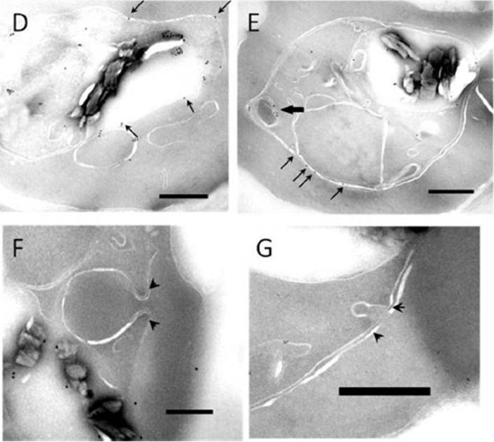 Immunoelectron micrographs showing intraparasitic localization of FKBP-HA-tagged P. falciparum Dyn1. The arrows indicate gold particle labeling on membranous structures. (E) Black arrow indicating HCs labeling. (F and G) Representative images showing that P. falciparum Dyn1 is absent from cytostomal collars (arrowheads). Scale bar, 250 nm.Milani KJ, Schneider TG, Taraschi TF. Defining the Morphology and Mechanism of the Hemoglobin Transport Pathway in Plasmodium falciparum-Infected Erythrocytes. Eukaryot Cell. 2015 14(4):415-26. PMID: