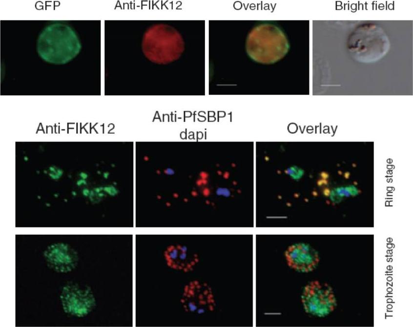 Upper panel: Immuno-localization of the FIKK12-GFP chimera in transgenic parasites. First image GFP fluorescence, second image cells incubated with anti-FIKK12 antibody, third image overlay of first and second image showing that FIKK12-GFP colocalizes with anti-FIKK12 at the surface of the infected RBC.Lower panel: Colocalization of FIKK12 with PfSBP1 in ring stage P. falciparum-infected erythrocytes. Second row: colocalization is lost at the trophozoite stage.Nunes MC, Goldring JP, Doerig C, Scherf A. A novel protein kinase family in Plasmodium falciparum is differentially transcribed and secreted to various cellular compartments of the host cell. Mol Microbiol. 2007 63:391-403.