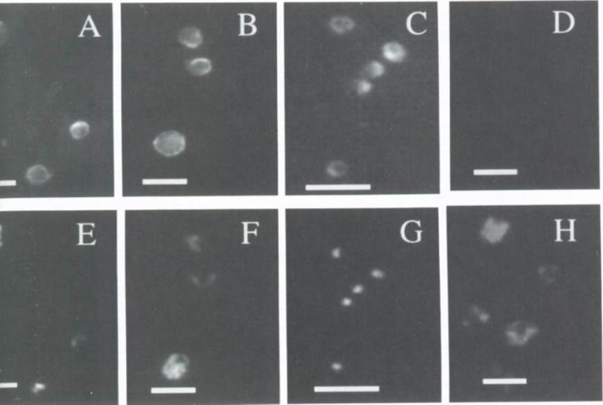 Immunofluorescence assay on acetone-fixed free parasites P. fblciparum, released from the host erythrocytes by nitrogen cavitation. The primary antibody was afinity-purified anti-PfATPase4 (1:200) and the secondary was Texas Red-conjugated (sheep) anti-mouse antibody (panels A,B.C). Panel D was incubated with control (prebleed) serum (1:200). Panels E, F, G and H show the same field as A. C. E and G but reveal the nuclear stain Hoescht dye. Panels A/E, B:F and D/H show trophozoites and early schizonts; panels C/G show free merozoites. Size bar = lO mm. PfATPase4 is expressed throughout the asexual cycle. Antibody staining is markedly concentrated in specific locations around the periphery of the parasites (4B), and could be associated with the plasma membrane itself and/or vesicles located in the cytoplasm, concentrated beneath the plasma membrane.Dyer M, Jackson M, McWhinney C, Zhao G, Mikkelsen R. Analysis of a cation-transporting ATPase of Plasmodium falciparum. Mol Biochem Parasitol. 1996 78:1-12. Copyright Elsevier 2010.