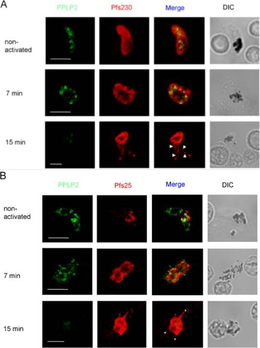 Location of PPLP2 in P. falciparum gametocytes during activation. A. Cultures of gametocytes before activation, and at 7 and 15 min post-activation, were labelled with antiserum B directed against PPLP2 (green) and counterstained with (A) anti-Pfs230 antisera (red) or (B) anti-Pfs25. The corresponding differential interference contrast (DIC) images are shown. Note that mature P. falciparum gametocytes have a banana-like shape but round up during activation. Bar, 5 μm (A) and 2 μm (B). Deligianni E, Morgan RN, Bertuccini L, Wirth CC, Silmon de Monerri NC, Spanos L, Blackman MJ, Louis C, Pradel G, Siden-Kiamos I. A perforin-like protein mediates disruption of the erythrocyte membrane during egress of Plasmodium berghei male gametocytes. Cell Microbiol. 2013 15(8):1438-55 PMID: