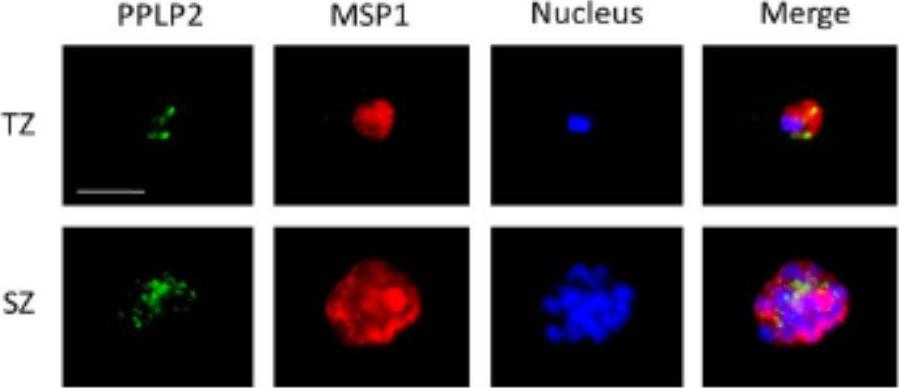 PPLP2 localization in asexual blood stage parasites. PPLP2-positive vesicular structures are present in the cytoplasm of trophozoites (TZ) and schizonts (SZ). PPLP2 was immunolabelled with mouse anti-PPLP2RP1 antisera (green), the asexual blood stages were visualized by rabbit anti-MSP1 antisera (red). Nuclei were highlighted by Hoechst stain (blue). PPLP2 first appeared in the trophozoites stage and here localized in vesicular structures. Multiple PPLP2-positive vesicular structures were detected also in mature schizonts. The blood stage parasites were highlighted by labelling of MSP1.Wirth CC, Glushakova S, Scheuermayer M, Repnik U, Garg S, Schaack D, Kachman MM, Weißbach T, Zimmerberg J, Dandekar T, Griffiths G, Chitnis CE, Singh S, Fischer R, Pradel G. Perforin-like protein PPLP2 permeabilizes the red blood cell membrane during egress of Plasmodium falciparum gametocytes. Cell Microbiol. 2014 Mar 7.