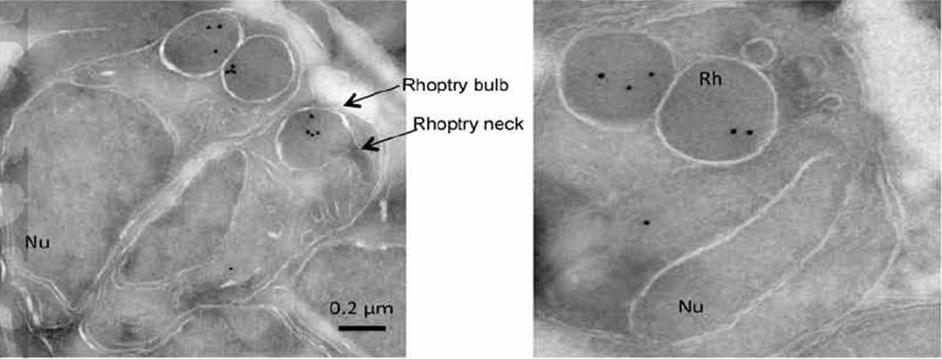 Localization of PfTRAMP by immuno-electron microscopy. Electron micrographs showing immuno-gold staining of P. falciparum schizonts (A) and merozoites (B) using anti- PfTRAMP antibodies. PfTRAMP localizes to the bulb region of rhoptries in merozoites developing within a schizont (A) as well as free merozoites (B).(Rh: rhoptry, Nu: nucleus).Siddiqui FA, Dhawan S, Singh S, Singh B, Gupta P, Pandey A, Mohmmed A, Gaur D, Chitnis CE. A Thrombospondin Structural Repeat Containing Rhoptry Protein from Plasmodium falciparum Mediates Erythrocyte Invasion. Cell Microbiol. 2013 15(8):1341-56