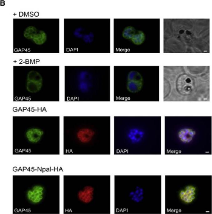 (B) Effect of 2-BMP (2-bromohexadecanoic acid) on PfGAP45 localization. Late schizonts (44–48 hr after invasion) were treated with 50 mM 2-BMP, and PfGAP45 targeting to the inner membrane complex (IMC) was assessed with anti-PfGAP45 antibodies in immunofluorescence assays. DMSO treated parasites were used as a control. Scale bars represent 1 mm. (D) Mutation of the PfGAP45 N-terminal palmitoylation site does not prevent IMC targeting. Anti-HA and anti-PfGAP45 antisera were used to follow localization of tagged and endogenous GAP45 by immunofluorescence in late schizont stage PfGAP45-HA and PfGAP45-Npal-HA expressing parasites. Scale bars represent 1 mm.Jones ML, Collins MO, Goulding D, Choudhary JS, Rayner JC. Analysis of protein palmitoylation reveals a pervasive role in Plasmodium development and pathogenesis. Cell Host Microbe. 2012 12(2):246-58.