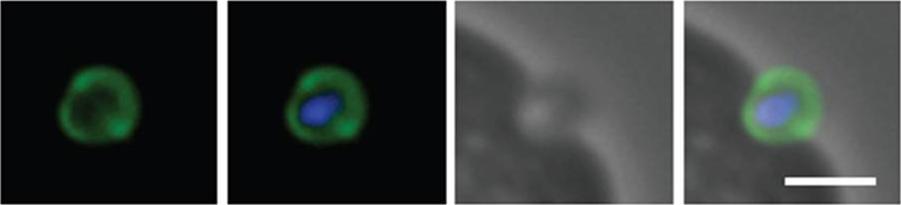 Schizont and merozoite culture was incubated overnight with 0.1µM cytochalasin D to inhibit invasion. Thin smeared on a glass slide, fixed in methanol, stained with rabbit anit-GAP45 polyclonal serum at 1:200 and secondary Alexa-Flor488 anti-Rabbit. Dual colour fluorescence images were captured using a Carl Zeiss Axioskop 2 microscope at 100x using Oil imersion. Nucleus is marked with DAPI. Scale bar indicate 1µM. Invading merozoite is shown with GAP45 clearly marking the periphery (shown to be the IMC by immuno-EM) and suggesting of localization to tight junction.Baum J, Richard D, Healer J, Rug M, Krnajski Z, Gilberger TW, Green JL, Holder AA, Cowman AF. A conserved molecular motor drives cell invasion and gliding motility across malaria life cycle stages and other apicomplexan parasites. J Biol Chem. 2006 281(8):5197-208.