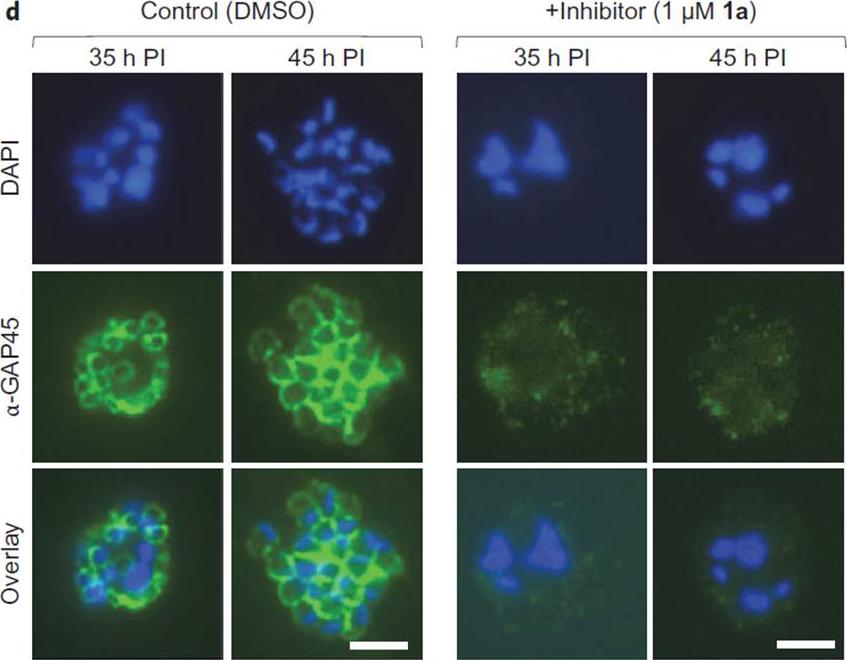 N-Myristoyltransferase (NMT) inhibition results in loss of the IMC and irreversible loss of parasite viability before parasite egress. d, Indirect immunofluorescence microscopy of parasites 35 h or 45 h PI, cultured in the presence of NMT inhibitor (1 mM 1a) or DMSO. Green, secondary antibody fluorescence; blue, DAPI (nuclear stain). All images at identical magnification. Scale bars, 5 mm. In Plasmodium, nuclear division precedes cell division, and the IMC initially appears as small ring-like structures, which then extend around developing merozoites during schizont segmentation (cell division). This transition was recapitulated in immunofluorescence images of DMSO-treated parasites at 35 and 45 h PI, whereas in the inhibitor treated parasites the IMC structure was not visible at either time point.Wright MH, Clough B, Rackham MD, Rangachari K, Brannigan JA, Grainger M, Moss DK, Bottrill AR, Heal WP, Broncel M, Serwa RA, Brady D, Mann DJ, Leatherbarrow RJ, Tewari R, Wilkinson AJ, Holder AA, Tate EW. Validation ofN-myristoyltransferase as an antimalarial drug target using an integratedchemical biology approach. Nat Chem. 2014 6(2):112-21.