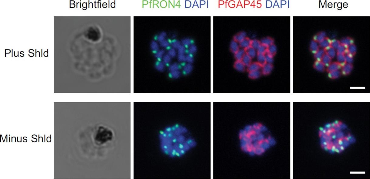IFA of parasites grown in the presence and absence of Shld probed with antibodies against PfRON4 (green) and PfGAP45 (red). Bars, 2 mm. Staining for PfGAP45, a soluble protein that complexes with PfGAP50 (along with PfMyoA and PfMTIP) to localize to the inner membrane complex (IMC), revealed readily detected expression of the PfGAP45 protein but the absence of normal morphology in PfCyc1-deficient parasites. In contrast, IFAs against the rhoptry protein PfRON4 suggests unencumbered rhoptry formation. Similarly, IFA against the In contrast, IFAs against the rhoptry protein PfRON4 suggests unencumbered rhoptry formation.Robbins JA, Absalon S, Streva VA, Dvorin JD. The Malaria Parasite Cyclin H Homolog PfCyc1 Is Required for Efficient Cytokinesis in Blood-Stage Plasmodium falciparum. MBio. 2017 Jun 13;8(3). pii: e00605-17.