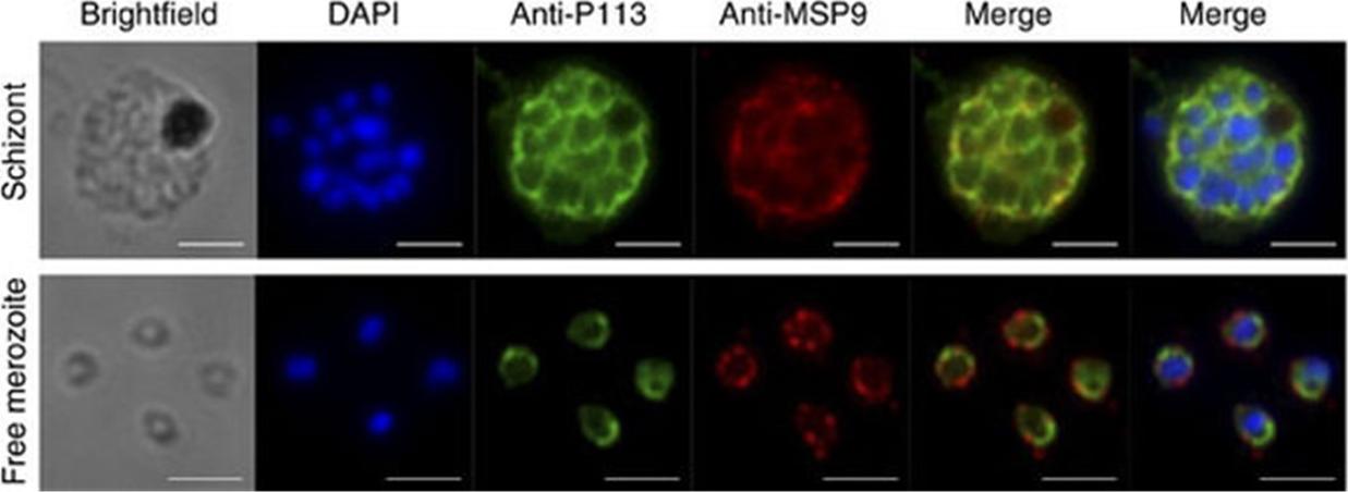 P113 is expressed in schizonts and on the surface of free merozoites. Fixed blood-stage P. falciparum schizonts and free merozoites were probed with anti-P113 antibodies (green), the merozoite surface marker anti-MSP9 (red) and nucleic acid stained with DAPI (blue). Scale bars, 3 mm. P113, is expressed in early and late-stage schizonts and on the surface of free merozoites by co-staining with the established merozoite surface markers MSP9.Galaway F, Drought LG, Fala M, Cross N, Kemp AC, Rayner JC, Wright GJ. P113 is a merozoite surface protein that binds the N terminus of Plasmodium falciparum RH5. Nat Commun. 2017 8:14333. PMID: 28186186