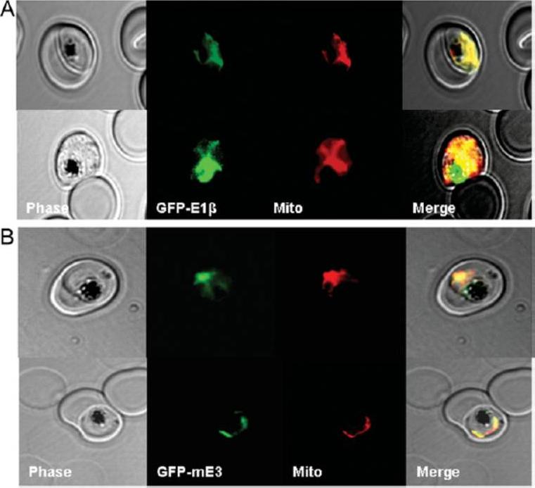 Localization of components of the mitochondrial branched chain KADH complexes. The localization of the E1β-subunit of P. falciparum BCKDH complex and the mitochondrial lipoamide dehydrogenase were analysed by expressing the first 390 and 653 nucleotides respectively tagged with GFP in erythrocytic stages of the parasite. (A) E1β-subunit of BCKDH. Phase, phase contrast image; GFP–E1β, image obtained with GFP channel; Mito, image obtained with rhodamine channel representing the localization of MitoTracker CMred; Merge, merged image. (B) Mitochondrial lipoamide dehydrogenase. Phase, phase-contrast image; GFP–mE3, image obtained with GFP channel; Mito, image obtained with rhodamine channel representing the localization of MitoTracker CMred; Merge, merged image.Günther S, McMillan PJ, Wallace LJ, Müller S. Plasmodium falciparum possesses organelle-specific alpha-keto acid dehydrogenase complexes and lipoylation pathways. Biochem Soc Trans. 2005 33:977-80.