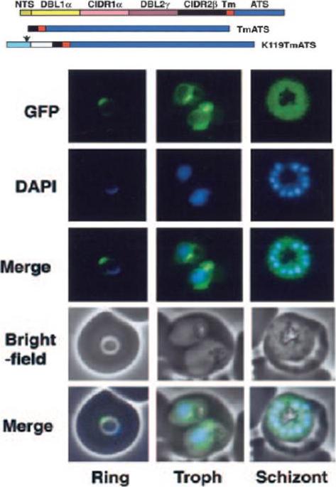 Expression of PfEMP1-GFP chimeras in P falciparum–infected RBCs. Fluorescence images of 3D7-TmATS at different stages.Spycher C, Rug M, Klonis N, Ferguson DJ, Cowman AF, Beck HP, Tilley L. Genesis of and trafficking to the Maurer's clefts of Plasmodium falciparum-infected erythrocytes. Mol Cell Biol. 2006 26:4074-85.