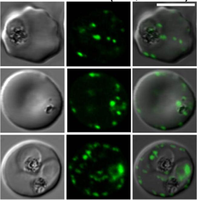 Confocal fluorescence microscopy images of transfected 3D7 P. falciparum-infected RBCs expressing a GFP chimeras directed to the Maurer’s clefts and red blood cell membrane. DIC image, the GFP fluorescence signal and an overlay of a transfectant expressing a fragment of P. falciparum erythrocyte membrane protein-1 in a chimeric construct: K119-EMP1-GFP. Scale bar = 5 µm. In trophozoite stage parasites K119-PfEMP1-GFP is associated with the Maurer’s clefts (top and middle rows). In more mature stages a weak rim signal is observed consistent with transfer of some of the K119-PfEMP1-GFP to the RBC membrane.Tilley L, McFadden G, Cowman A, Klonis N. Illuminating Plasmodium falciparum-infected red blood cells. Trends Parasitol. 2007 23:268-77.