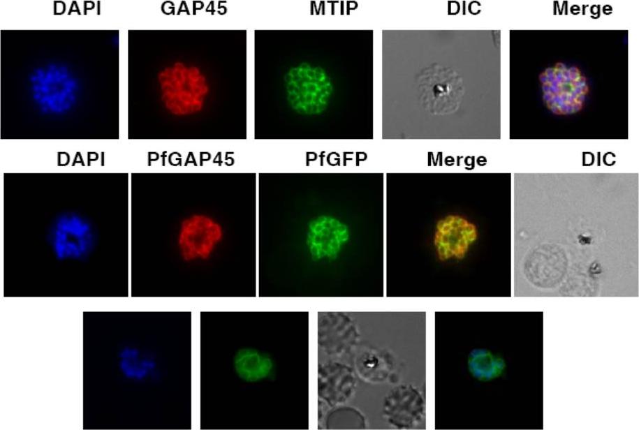 Upper row: PfGAP45 co-localizes with the IMC marker PfMTIP. Immunofluorescence assays were performed using anti-GFP (red) and anti-PfMTIP (green) antibodies on parasites over-expressing PfGAP45-GFP. PfGAP45 shows co-localization with PfMTIP around the periphery of merozoites in mature schizonts. Middle row: PfGAP45 phosphorylation mutants co-localize with endogenous PfGAP45. Immunofluorescence assays were performed using anti-GFP (green) and anti-PfGAP45 (red) antibodies to localize episomally expressing GAP45-GFP and endogenous PfGAP45.Lower row: Live Imaging of PfGAP45 GFP in parasites over-expressing PfGAP45-GFP was performed after labeling the nuclei with DAPI. Thomas DC, Ahmed A, Gilberger TW, Sharma P. Regulation of Plasmodium falciparum Glideosome Associated Protein 45 (PfGAP45) Phosphorylation. PLoS One. 2012;7(4):e35855.