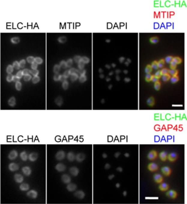 PfELC expression matches that of known glideosome components in P. falciparum schizonts. Immunofluorescent detection of HA-tagged ELC and either MTIP or GAP45 in mature schizonts and merozoites. Merged colour images are also shown, with ELC-HA (green) and MTIP or GAP45 (red). Nuclei are stained with DAPI (blue). Scale bar: 2 μm. Immunofluorescence analysis of fixed blood-stage P. falciparum with HA-specific antibodies showed co-localisation of the protein with GAP45 and MTIP in late, segmented schizonts.Green JL, Wall RJ, Vahokoski J, Yusuf NA, Ridzuan MAM, Stanway RR, Stock J, Knuepfer E, Brady D, Martin SR, Howell SA, Pires IP, Moon RW, Molloy JE, Kursula I, Tewari R, Holder AA. Compositional and expression analyses of the glideosome during the Plasmodium life cycle reveal an additional myosin light chain required for maximum motility. J Biol Chem. 2017 Sep 11.