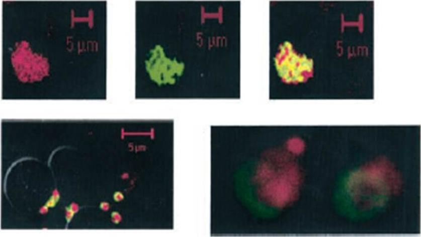 Immunofluorescence studies performed using anti-PfPKB antisera on thin blood smears of P. falciparum cultures revealed that only late schizonts but no other asexual stages (Hoechst-stained) were recognized by this anti-sera. Upper row: Rabbit antisera against PfPKB (red) and mouse antisera against MSP1 (green) was used to localize these proteins in late/segmented schizonts, or in free merozoites (lower row). The right panel in the lower row shows a zoomed image of merozoites stained with MSP1 and PfPKB antisera. PfPKB exhibited a diffused staining pattern in segmented schizonts, indicating its presence in the cytoplasm, and also exhibited some co-localization with MSP1. In free merozoites PfPKB seems to be localized at the apical end.Kumar A, Vaid A, Syin C, Sharma P. PfPKB, a novel protein kinase B-like enzyme from Plasmodium falciparum: I. Identification, characterization, and possible role in parasite development. J Biol Chem. 2004 279:24255-64.