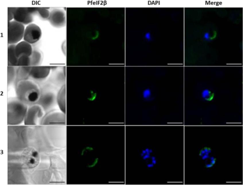 Localization of PfeIF2b. Immunolocalization assays.Asynchronous cultures of PfeIF2b-Hatag recombinant strain of P.falciparum 3D7were fixed with formalin and paraffin embedded. Sections were incubated with an anti-HAtag(biotin) antibody recognized by a streptavidine-Alexafluor488-labeled conjugated added with DAPI to label nuclei. Fluorescence staining was analyzed using a Zeiss LSM880 confocal microscope.The merged image of the doubl estained (PfeIF2b-HAtag,DAPI) and differential interference contrast (DIC )images are also presented. Immunofluorescence assays revealed a cytoplasmic localization of PfeIF2b in the trophozoite (panel1), young schizont (panel2), or mature schizont (panel3) stages. Note that no staining was observed in ring-stage. No staining was observed when the primary antibody (anti-HA) was omitted (not shown). Bar = 5 μm.Tellier G, Lenne A, Cailliau-Maggio K, Cabezas-Cruz A, Valdés JJ, Martoriati A, Aliouat el M, Gosset P, Delaire B, Fréville A, Pierrot C, Khalife J. Identification of Plasmodium falciparum Translation Initiation eIF2β Subunit: Direct Interaction with Protein Phosphatase Type 1. Front Microbiol. 2016 26;7:777.