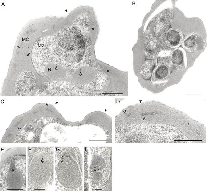 Immunoelectron microscopic localization of STEVORs. Ultrathin sections of schizont stage-IE were analyzed using anti-STEVOR (anti-PFL2610w) antibody. Gold labelling is observed on the IE surface (A and C, black arrowheads), merozoite surface (A, black arrows), in MC (A, C and D, white arrowheads), rhoptries (A, white arrows) and rhoptry neck (E-H, white arrows). No gold particles are observed with pre-immune serum, shown for an IE containing developing merozoites (B). Scale bars are 0.5 μm for A and 1 μm for B-H.Khattab A, Bonow I, Schreiber N, Petter M, Schmetz C, Klinkert MQ. Plasmodium falciparum variant STEVOR antigens are expressed in merozoites and possibly associated with erythrocyte invasion. Malar J. 2008 Jul 23;7:137.