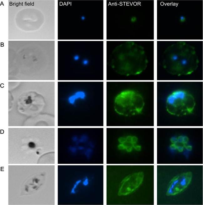 IFA images of methanol-fixed slides of the field isolate Gb337 in (A) early ring, (B) ring, (C) trophozoite, (D) schizont and (E) gametocyte stages visualized using anti-STEVOR (anti-PFL2610w) antibody. The localization of STEVOR proteins to the merozoite surface and the rhoptries together with its prevalence as a released component in the invading merozoite suggest a role of these antigens in adhesion and/or immune evasion in the erythrocyte invasion process.Khattab A, Bonow I, Schreiber N, Petter M, Schmetz C, Klinkert MQ. Plasmodium falciparum variant STEVOR antigens are expressed in merozoites and possibly associated with erythrocyte invasion. Malar J. 2008 Jul 23;7:137.