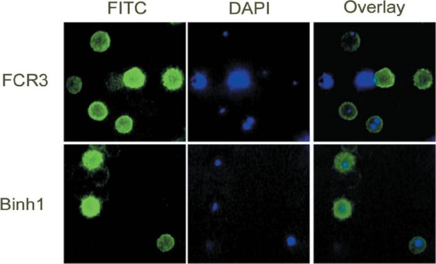 Indirect fluorescence assay of fixed IEs. (A) Laboratory strains FCR3 (top panels) and Binh1 (bottom panels) were stained with affinity-purified anti-rif-29 antibodies, and the secondary antibody was FITC-conjugated goat anti-human immunoglobulins (green; left panels). Parasite nuclei were visualized with DAPI (blue; middle panels), smaller spots are representative of the ring stages and larger spots are trophozoites. Both images were merged to show concordance (right panels). The protein was localized by fluorescence microscopy on the membrane of ring and young trophozoite-infected erythrocytesAbdel-Latif MS, Khattab A, Lindenthal C, Kremsner PG, Klinkert MQ. Recognition of variant Rifin antigens by human antibodies induced during natural Plasmodium falciparum infections. Infect Immun. 2002 70:7013-21. PMID: