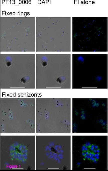 Immunofluorescence analysis of PF13_0006 expression in fixed asexual Plasmodium falciparum parasites. Ring stage parasites (first two rows) and schizonts (last rows) of the 3D7 line were fixed, permeabilized, and analyzed by staining with rabbit anti-PF13_0006 IgG (green). Nuclei were stained with DAPI (blue). DIC shadow-cast images with the fluorescence image superimposed in the first two coloumns and the fluorescence image (FI) alone in the last coloumn. Scale bar 5 mm. no RIFIN protein was detected in the ring stages (first and second row), whereas the proportion of anti-PF13_0006 IgG stained schizonts was higher than 90% (third and fourth row).Mwakalinga SB, Wang CW, Bengtsson DC, Turner L, Dinko B, Lusingu JP, Arnot DE, Sutherland CJ, Theander TG, Lavstsen T. Expression of a type B RIFIN in Plasmodium falciparum merozoites and gametes. Malar J. 2012 Dec 21;11(1):429.