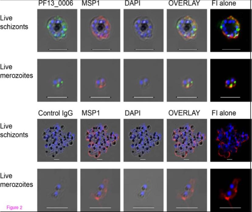 Immunofluorescence analysis of PF13_0006 expression in live asexual Plasmodium falciparum parasites. Live schizonts (first row) and merozoites (second row) of the 3D7 parasite line were analyzed by staining with anti-PF13_0006 IgG (green) and anti-MSP-1 Ab (red). As a control, live schizonts (third row) and live merozoites (fourth row) were stained with control IgG (green) and anti-MSP-1 Ab (Red). Nuclei were stained with DAPI (blue). DIC shadow-cast images with the fluorescence image superimposed in the first four coloumns and the fluorescence image (FI) alone in the last coloumn to augment the visualisation of the staining. Scale bar 5 mm. Abs stained the dividing merozoites inside the infected erythrocyte. Location of Rifin appeared to overlap with MSP-119.Mwakalinga SB, Wang CW, Bengtsson DC, Turner L, Dinko B, Lusingu JP, Arnot DE, Sutherland CJ, Theander TG, Lavstsen T. Expression of a type B RIFIN in Plasmodium falciparum merozoites and gametes. Malar J. 2012 Dec 21;11(1):429.