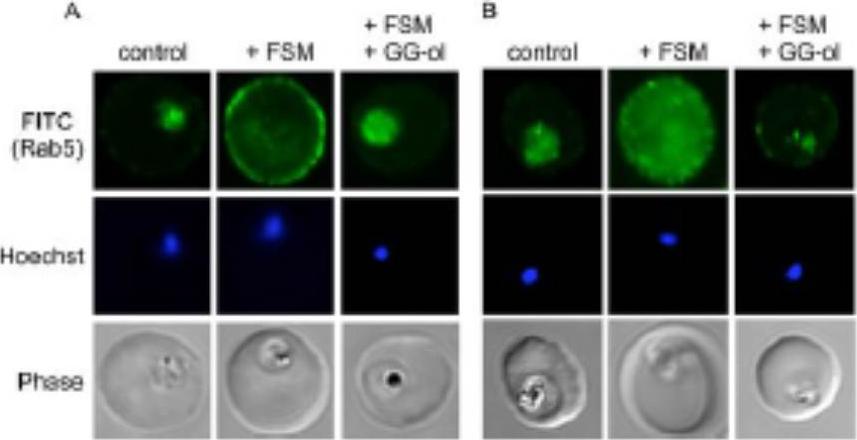 Confocal immunofluorescence with either anti-PfRab5a (A) or anti-PfRab5c (B) in untreated parasites (control) compared to fosmidomycin (+ FSM) and fosmidomycin + geranylgeraniol (+FSM +GG-ol) treated parasites. Pf-Rab5a and Pf-Rab5c were dispersed in punctae throughout malaria parasite cells. Upon fosmidomycin treatment, a dramatic mislocalization of Rab5a occurred in the majority of treated cells, such that Rab5a was no longer present within the parasite cell, but instead was found at the membrane of the host erythrocyte.Howe R, Kelly M, Jimah J, Hodge D, Odom AR. Isoprenoid biosynthesis inhibition disrupts Rab5 localization and food vacuolar integrity in Plasmodium falciparum. Eukaryot Cell. 2013 12(2):215-23 .