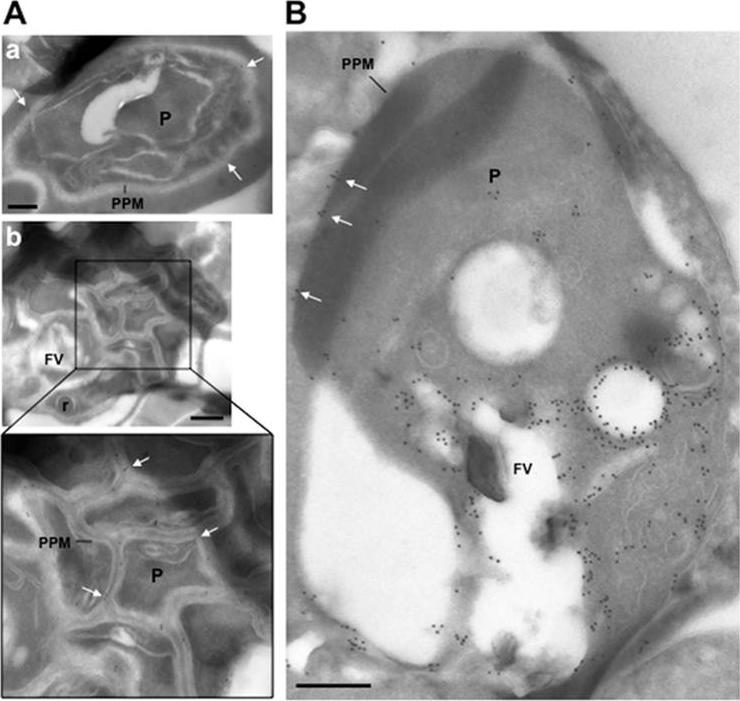 Ultrastructural detection of PfRab5b in P. falciparum-infected RBC. Immuno-electron microscopy of schizonts (A) and a large trophozoite (B) of P. falciparum labelled with specific anti-PfRab5B antibodies, revealing the presence of gold particles both on the food vacuole (FV) and the parasite plasma membrane (PPM, white arrows) in trophozoites and exclusively on parasite plasma membrane for late stages. P, parasite; r, rhoptry. Scale bars, 150 nm.Ezougou CN, Ben-Rached F, Moss DK, Lin JW, Black S, Knuepfer E, Green JL, Khan SM, Mukhopadhyay A, Janse CJ, Coppens I, Yera H, Holder AA, Langsley G. Plasmodium falciparum Rab5B Is an N-Terminally Myristoylated Rab GTPase That Is Targeted to the Parasite's Plasma and Food Vacuole Membranes. PLoS One. 2014 9(2):e87695.