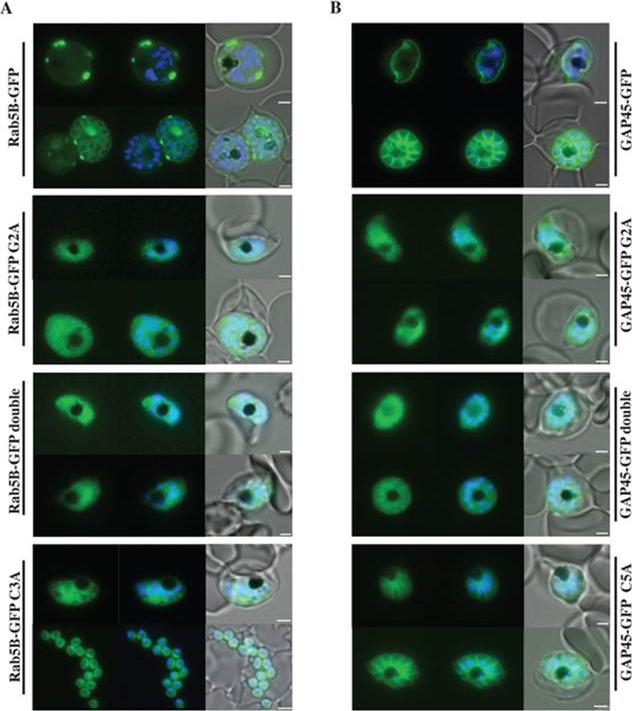 Localisation of PfRab5B-GFP fusion proteins in P. falciparum. Parasites were transfected with constructs expressing the N-terminal 28 amino acids of PfRab5B or 29 amino acids of PfGAP45 fused to GFP under a schizont stage-specific promoter (msp3 59UTR region). Localisation of PfRab5B28-GFP (A) and GAP4529-GFP fusions (B) as well as myristoylation (G2A) and palmitoylation-deficient fusions (C3A in PfRab5B28-GFP and C5A in GAP4529-GFP) were investigated. The first image in a series corresponds to GFP fluorescence, the second a merge of GFP fluorescence with nuclear DAPI stain, and the third a merge of GFP fluorescence, DAPI and bright field images. Size bars are 2 mm. GFP was observed at the plasma membrane (top right hand panel). In transgenic parasites that expressed GFP fused to G2A variants of both PfRab5B and GAP45 the association of GFP with the plasma membrane was lost and we observed a diffuse GFP-staining throughout the cytoplasm of the parasites .Ezougou CN, Ben-Rached F, Moss DK, Lin JW, Black S, Knuepfer E, Green JL, Khan SM, Mukhopadhyay A, Janse CJ, Coppens I, Yera H, Holder AA, Langsley G. Plasmodium falciparum Rab5B Is an N-Terminally Myristoylated Rab GTPase That Is Targeted to the Parasite's Plasma and Food Vacuole Membranes. PLoS One. 2014 9(2):e87695.