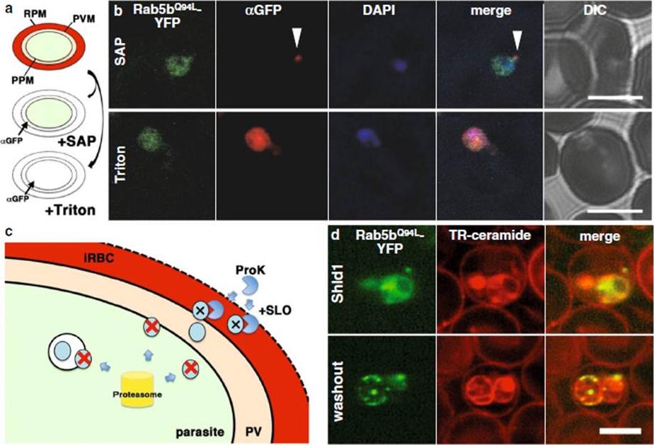 Transport of PfRab5bQ94L-YFP-DD to the cytoplasmic face of infected red blood cells on the TVN. a The selective permeabilization scheme. Saponin permeabilizes RBC plasma membrane (RPM) and PVM, which allows the detection of proteins localized to the outside of the parasite plasma membrane (PPM) or both sides of the PVM. Triton X-100 permeabilizes RPM, PVM, and PPM, allowing staining of the iRBCs, PV, and parasite cytosol with antibody. b Cells expressing PfRab5bQ94L-YFP-DD (green) were subjected to an antibody accessibility assay with anti-GFP antibody (red) prior to permeabilization with saponin (upper panel, SAP) or Triton X-100 (lower panel, Triton). After the saponin treatment, anti-GFP antibody labelled PfRab5bQ94L-YFP-DD secreted to the TVN (arrowhead), whereas PfRab5bQ94L-YFP-DD in the parasite cytosol was not labelled. Permeabilization with Triton X-100 allowed labelling of both the parasite cytosolic and TVN-localized PfRab5bQ94L-YFP-DD with anti-GFP antibody. c Schematic of the Shld1 washout assay and the protease accessibility assay. After removal of Shld1, cytosolic DD-tagged proteins are degraded (red cross and blue circle) by the parasite proteasome (yellow cylinder). DD-tagged proteins, inside of intracellular organelles or transported to the outside of the parasite (blue circular), are resistant to the proteasomal degradation. Since streptolysin O (SLO) permeabilizes RPM but not PVM, DD-tagged proteins in the RBC cytoplasm were selectively degraded by extracellular proteinase K (ProK) after permeabilization with SLO (black cross and blue circle). d Sub-cellular localization of PfRab5bQ94L-YFP-DD (green) after Shld1 stabilization for 24 h (upper panel, Shld1) and 2 h after Shld1 washout (lower panel, washout). After the removal of Shld1, the punctate signal of PfRab5bQ94L-YFP-DD localized to the TR-ceramide (red)-labelled parasite periphery. Bars 5 μm.Ebine K, Hirai M, Sakaguchi M, Yahata K, Kaneko O, Saito-Nakano Y. Plasmodium Rab5b is secreted to the cytoplasmic face of the tubovesicular network ininfected red blood cells together with N-acylated adenylate kinase 2. Malar J. 2016 15:323.
