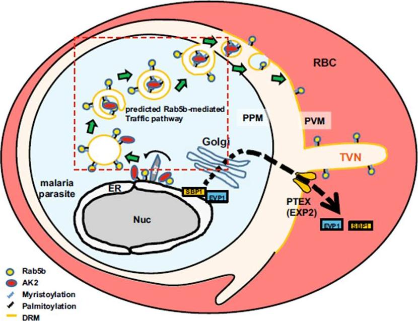 The hypothetical model of trafficking pathway involved in PfRab5b. N-acylated proteins, such as PfAK2, are recruited to novel compartment(s) adjacent to the ER, and packed into the multivesicular body or an autophagosome-like double membrane structure together with PfRab5b. The multivesicular body fuses with the PPM, and internal vesicles fuses with the PVM. Rab5b is clustered on the TVN. Nuc, nucleus; RBC, red blood cell; PTEX, Plasmodium translocon of exported proteins; PAT, palmitoyltransferase. EVP1 and SBP1 are exported proteins with and without thePlasmodium export element (PEXEL) signal, respectively .Ebine K, Hirai M, Sakaguchi M, Yahata K, Kaneko O, Saito-Nakano Y. Plasmodium Rab5b is secreted to the cytoplasmic face of the tubovesicular network in infected red blood cells together with N-acylated adenylate kinase 2. Malar J. 2016 15:323.