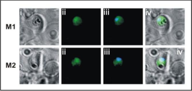 Indirect immunofluorescence of transgenic parasites stained with monoclonal anti c-myc primary antibody followed by anti-mouse cy2. (i) Bright field; (ii) anti-c-myc antibody; (iii) anti-c-myc/nuclear stain merged; (iv) merge of i and iii. The data show that the PfA-M1 transgenic protein is localized to the parasite cytosol. McGowan S, Porter CJ, Lowther J, Stack CM, Golding SJ, Skinner-Adams TS, Trenholme KR, Teuscher F, Donnelly SM, Grembecka J, Mucha A, Kafarski P, Degori R, Buckle AM, Gardiner DL, Whisstock JC, Dalton JP. Structural basis for the inhibition of the essential Plasmodium falciparum M1 neutral aminopeptidase. Proc Natl Acad Sci U S A. 2009 106:2537-42.